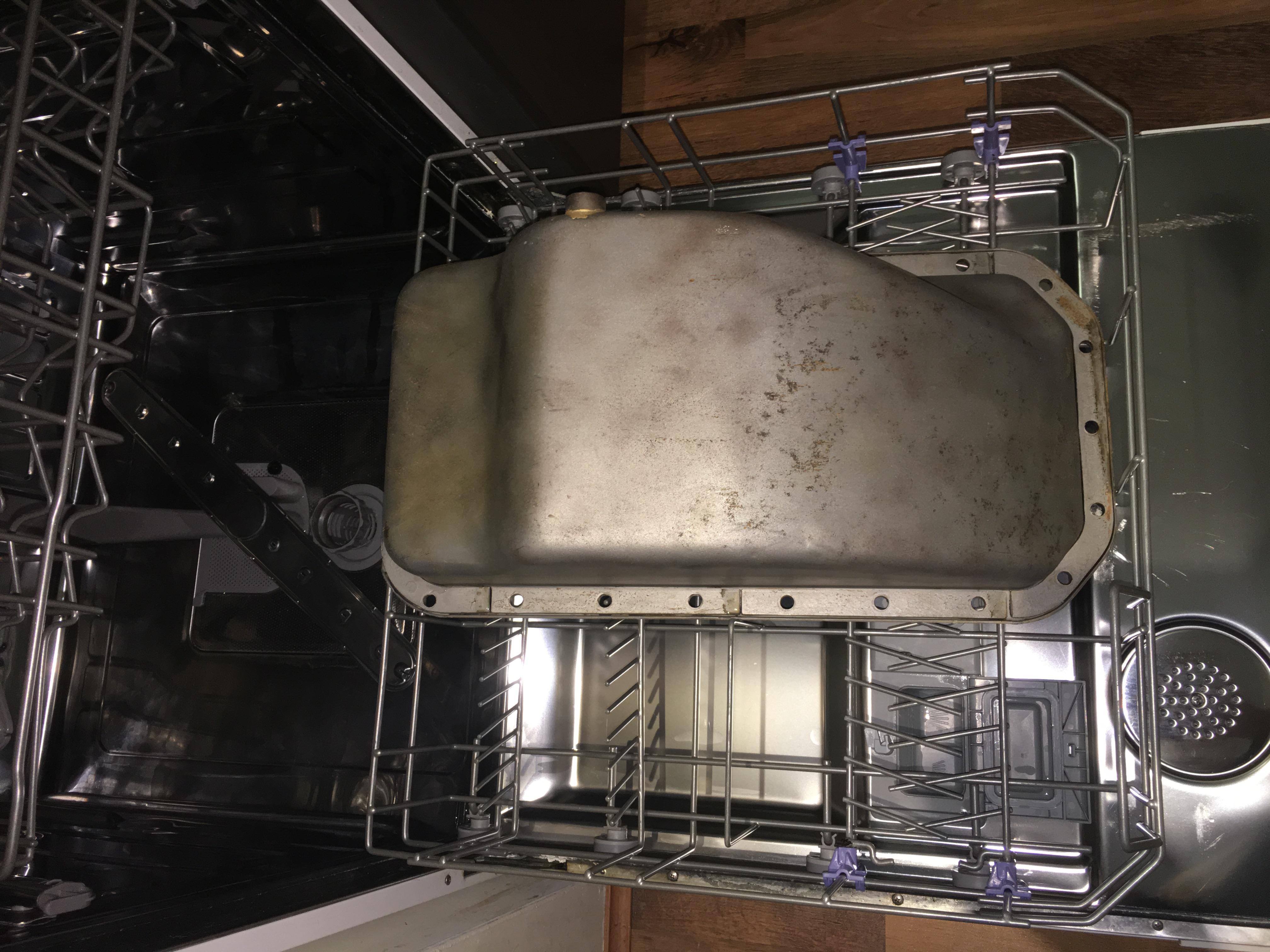 I degreased it and pressure washed it before blasting, then degreased and pressure washed 3 ~ 4 times to get rid of the lingering gunk under the windage tray. There seems to be some persistent gunk under there, and I don't want any stray blasting media getting in the oil. So the sump is now in the dishwasher