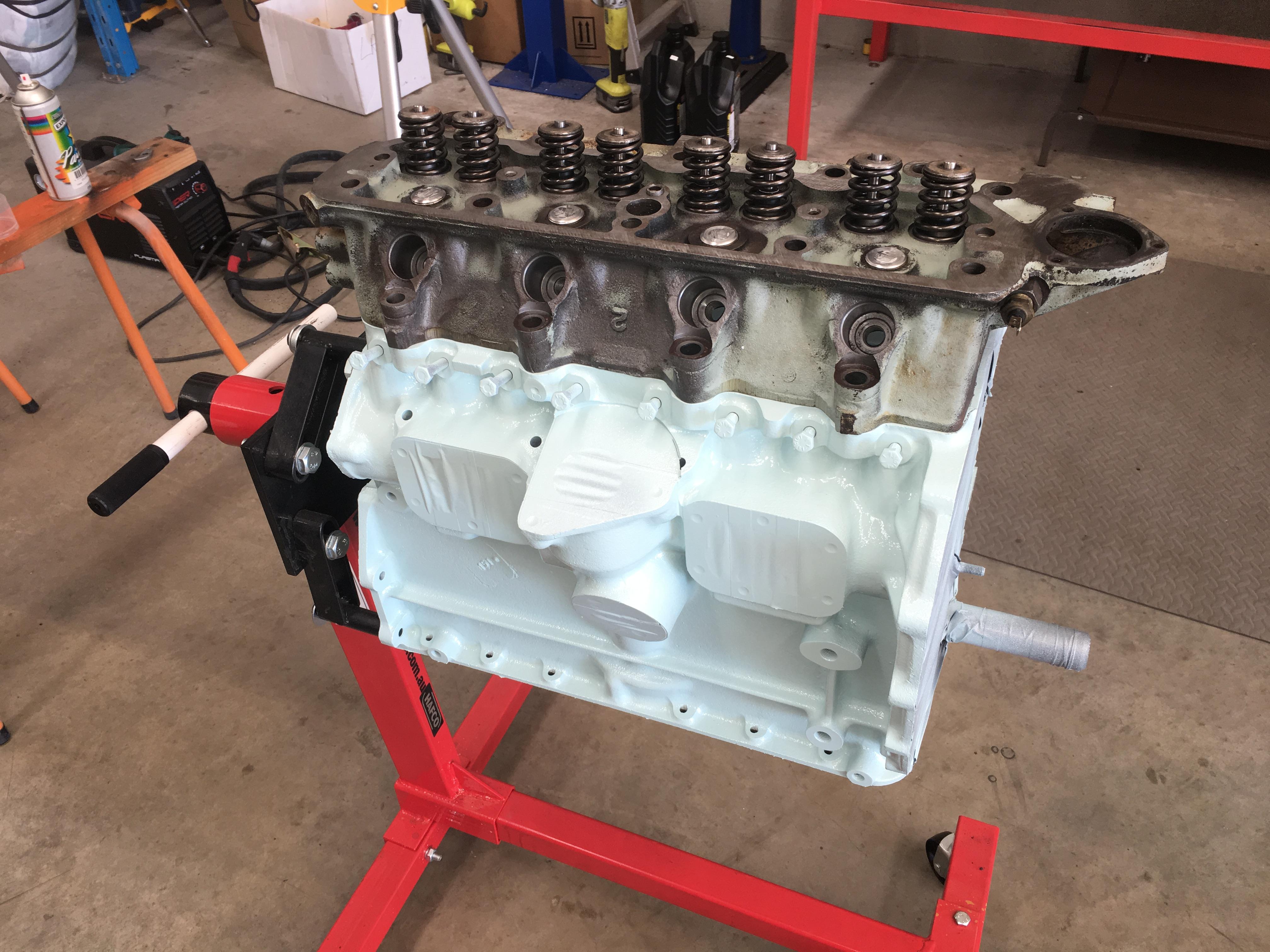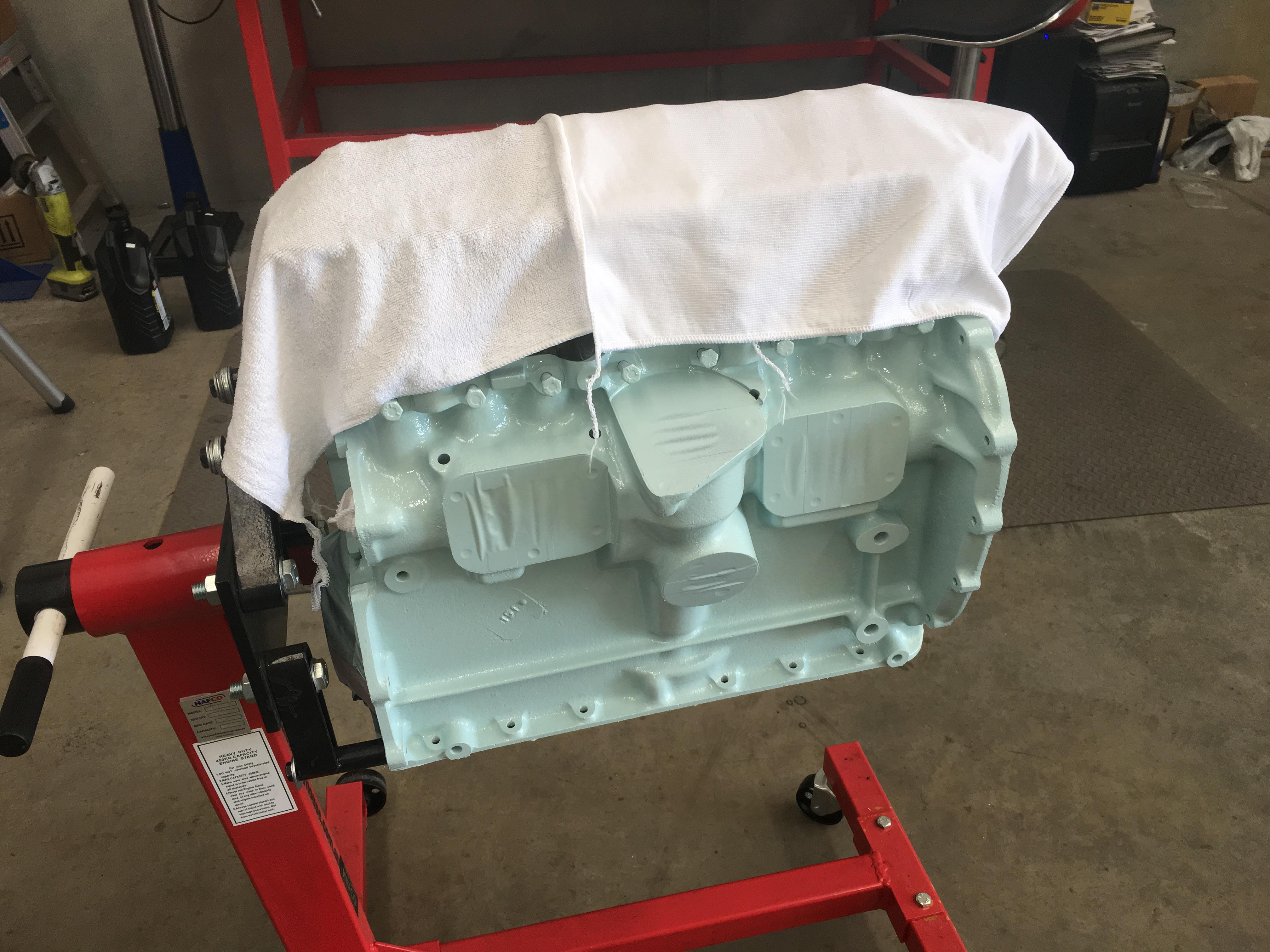 I'll leave the masking on until the paint has fully hardened, (that'll probably take a week for the air dry enamel to go off properly), so the block stays sealed. The head is just sitting on the still masked deck of the block only because it has to be somewhere.