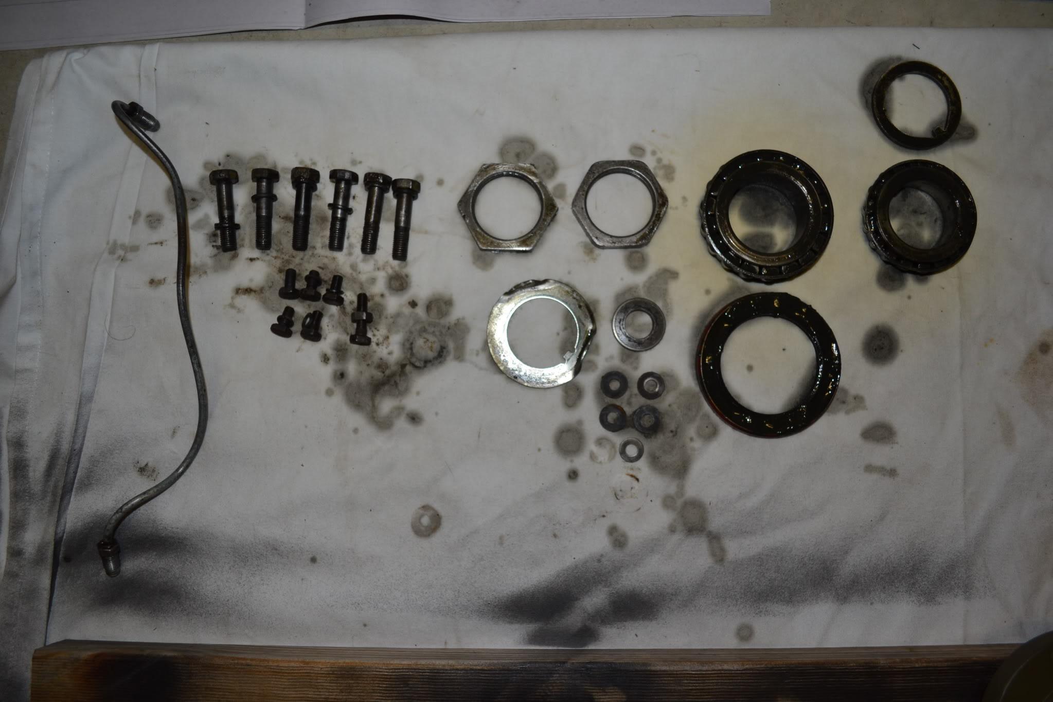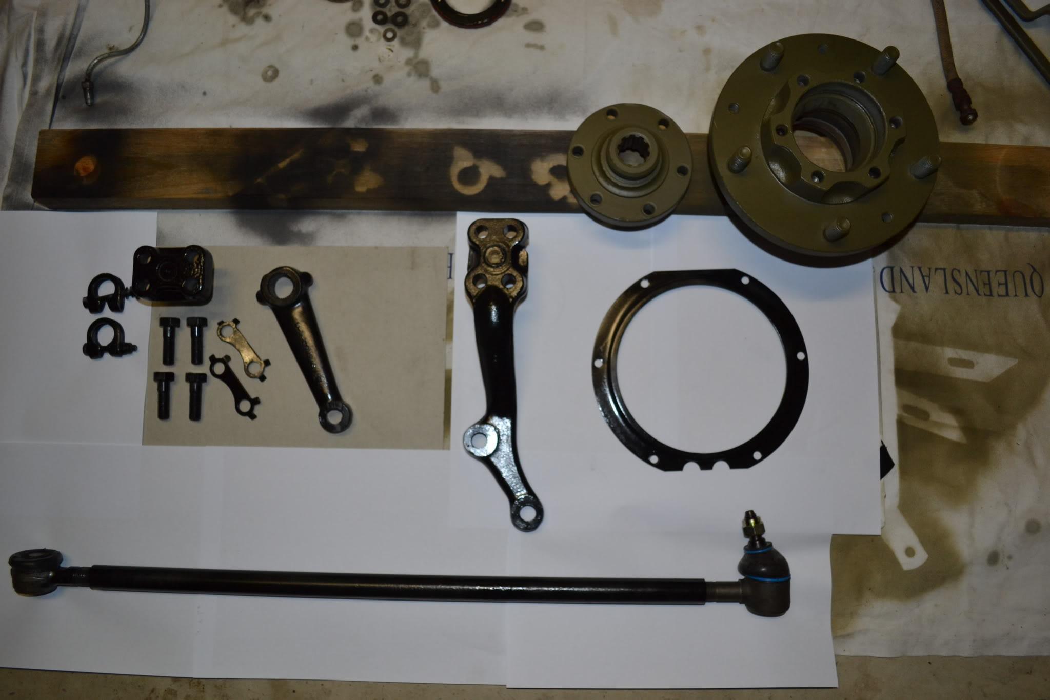 Here we have, swivel pin lever ( middle of picture ) Retainer for oil seal right hand side of picture, steering drop arm, left, bottom of picture longitudinal steering tube, with one new ball joint, old cut one in the other end still