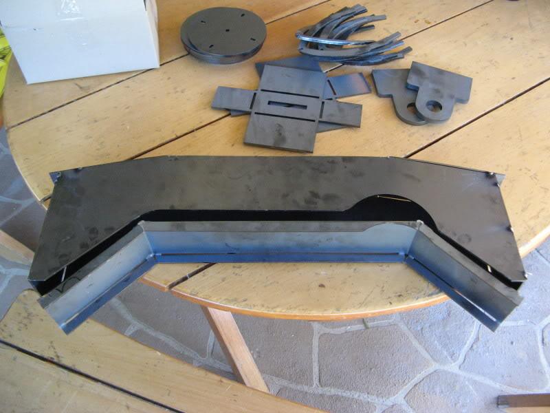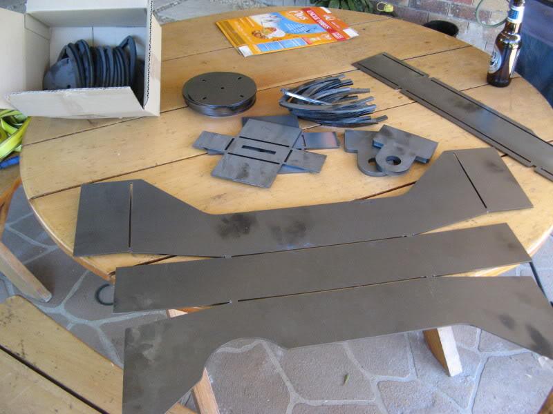 Basically in the first picture you can see the parts as received from the laser cutters. The large piece is the top and front and rear and ends of the crossmember, and the other thin flat piece up to the right is the base section of the cross member. (ignore all the other bits and pieces)