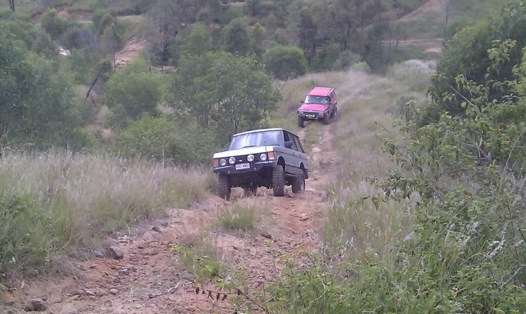 Anyway, we were all keen for a bit of a play, Greg had to hang around to assist harry with the DARE so Darren, Nick, Kelvin and myself went for a bit of a explore down to the creek track. I remember this track being quite a challenge but the recent deluge has made it truggy territory and a bit much for us mere mortals in full bodied rangies (and Suzuki) so we scratched that idea. We retreated back to the top near the campsite when Dave rocked up in Gumboot. off for another explore and did the loop track, not too hard but a bit of a tricky creek exit for some of the less modified (or straight paneled ) LR's would be the sticking point, not for us in old dunga Rangies (and Suzuki )