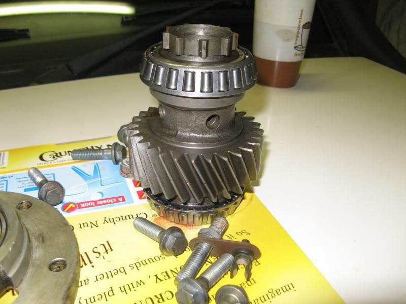 I don't think so gmeddy (but it has been a while for me). As in Pete's pictures, remove the six bolts and cover, and then ease off the round retaining plate which has the outer bearing race in the front face. Then the gear complete with bearings slides out, off the gearbox output shaft. If the splines are stripped it might help to gently rock the vehicle with the transfer case in either range. Be careful not to dent or score the flat surfaces of the cover and plate if you have to use a screwdriver.