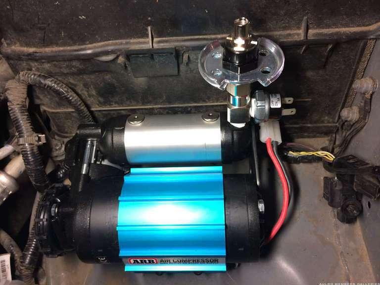 Mounted the ARB CKMA12 compressor in front of the main battery using 4 x 6mm rivnuts, which use a 10mm hole. Drilled in 3 stages, not a lot of room to get the rivnut tool in, but neat and firm.