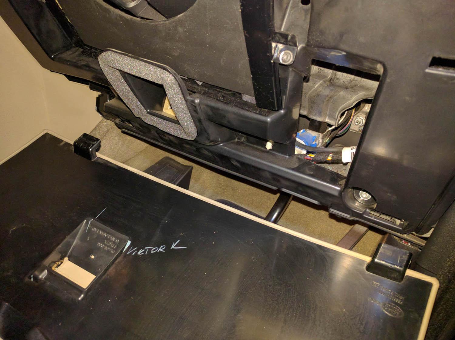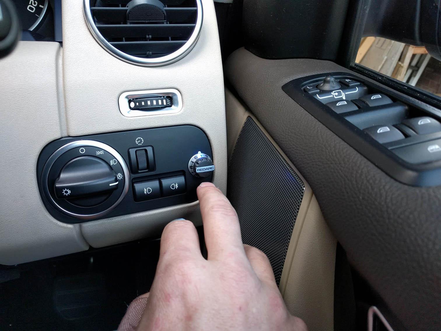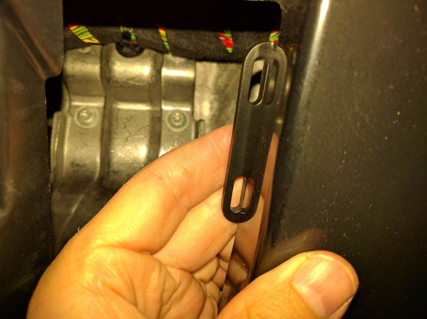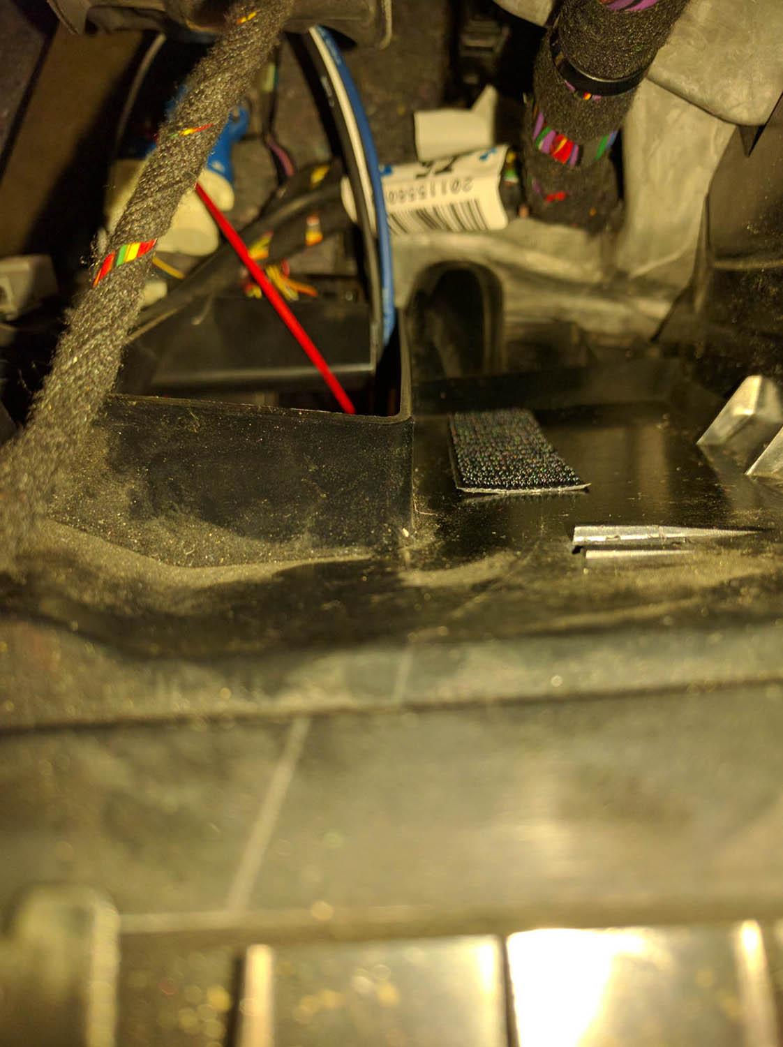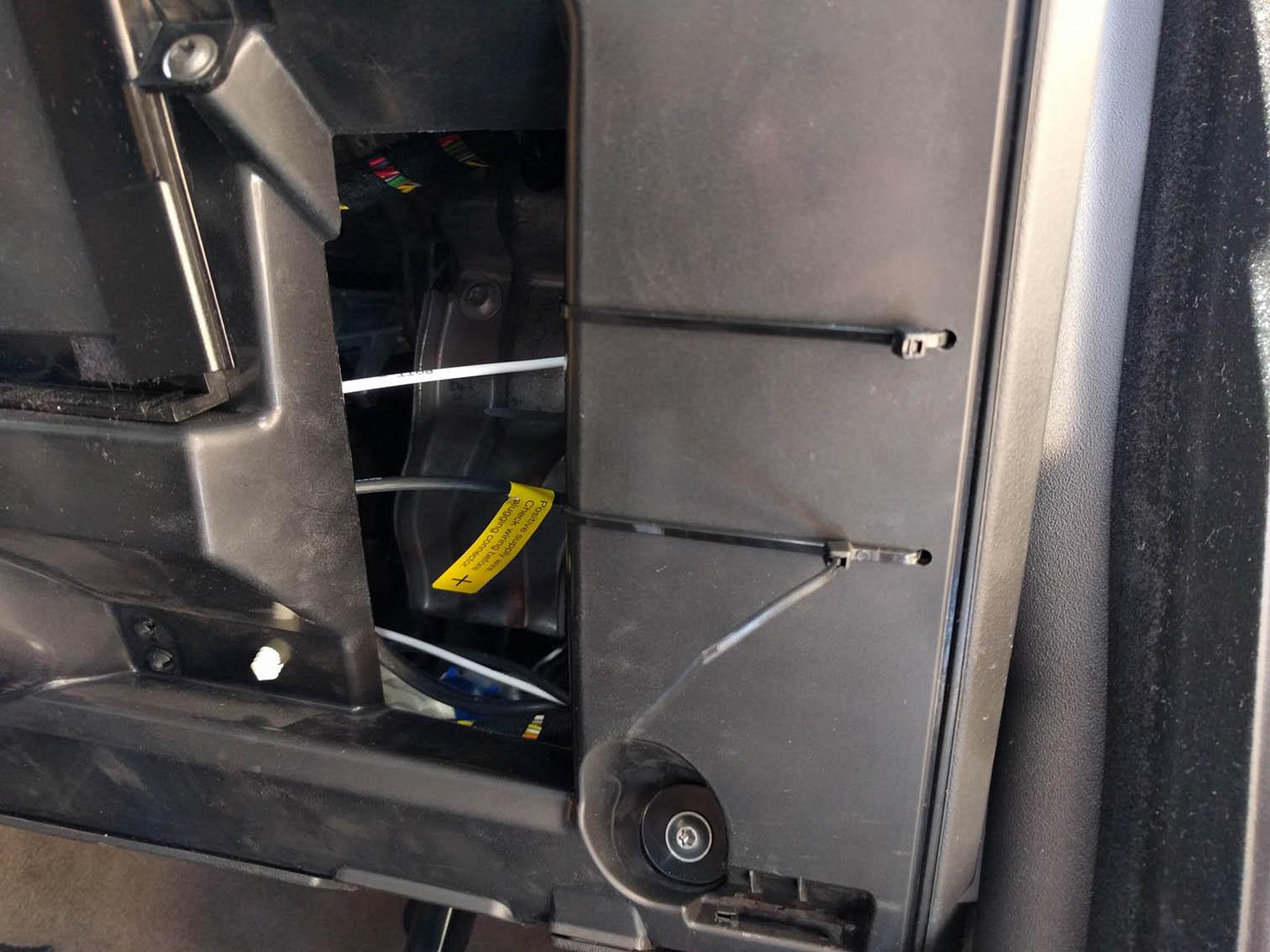 First reach up from the back and squeeze the tabs on the headlight control panel and push out. Then you can run some velcro down the inside for the Tow Pro. This is looking directly down through the panel: