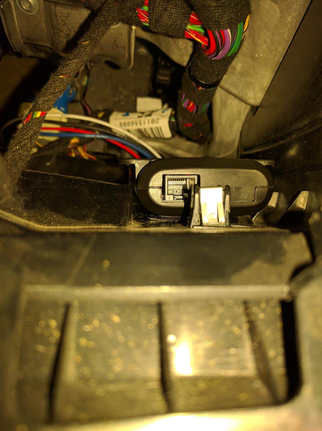 This seemed to have a couple of advantages.. it's easy to reach and remove if necessary, and sits directly below the remote head. You can also access both cables and connectors from straight under the steering wheel. But mainly, a nice tight fit in the panel which is about the same width.