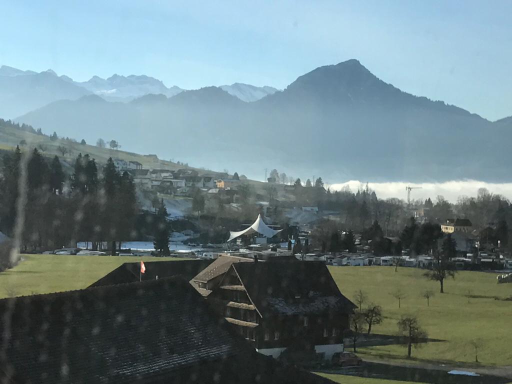 The best train trips in Switzerland are of course the smaller regional trains that twist and turn their way through many towns and valleys. Here's the one we caught from Rappersville to Luzern. Apologies for the dirt on the windows obscuring the view of the Alps! The route map is the drinks tray in each seating booth.