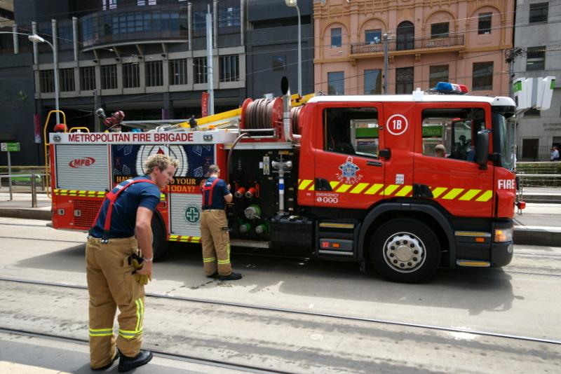 Bin fire at the big tram stop out the front of the Eye&Ear hospital, Victoria Pde, Melbourne.