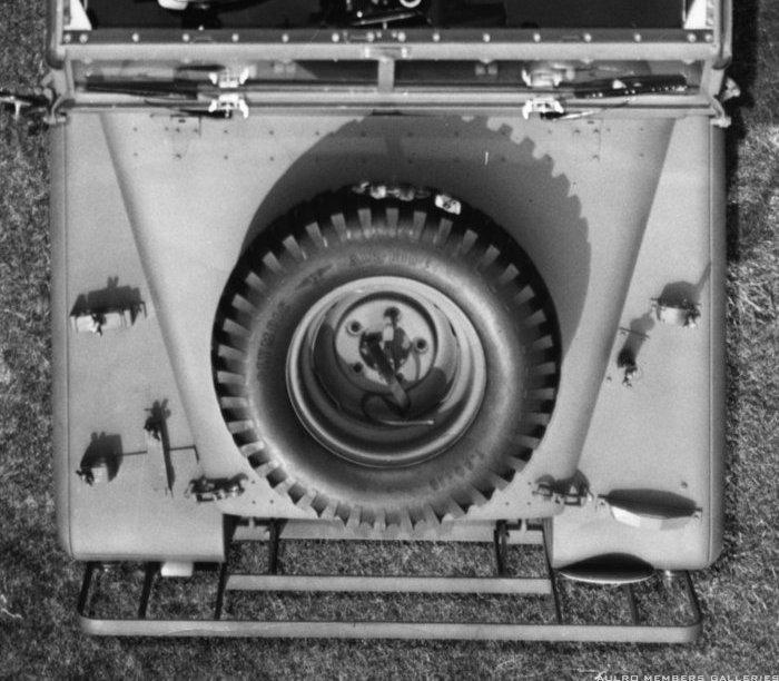 As for those that are a little mistified by the webbing strap in the centre of the bonnet mounted spare wheel, it is the windscreen tie down strap, when the screen is folded down, that is what the centre footman loop on the top of the screen is for, the outer two have the canopy straps through them.