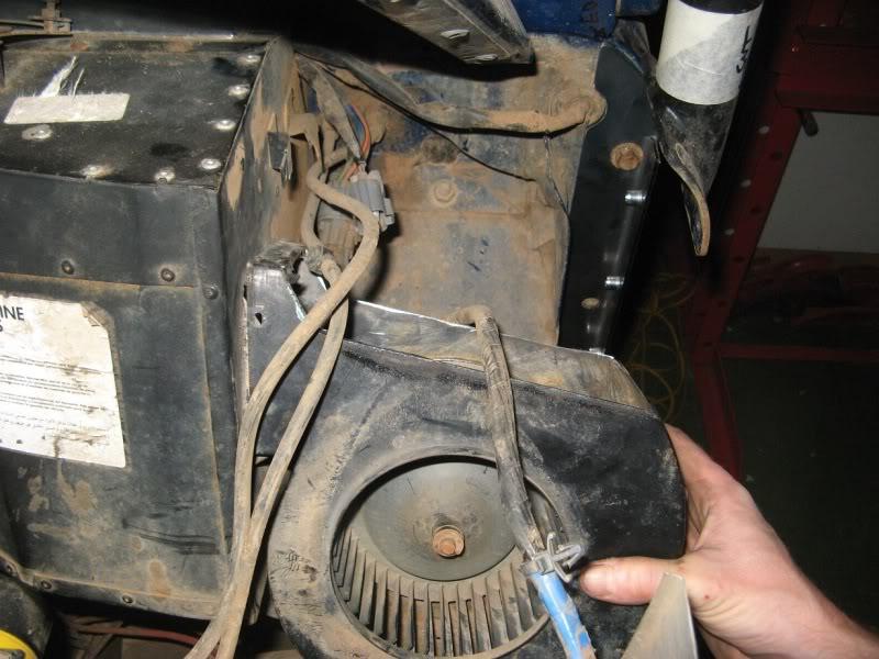 Next the heater blower gets in the way of where the top tube will run. To save remvoing the entire heater, I chisseled off the rivets holding the motor/blower assembly on and removed that