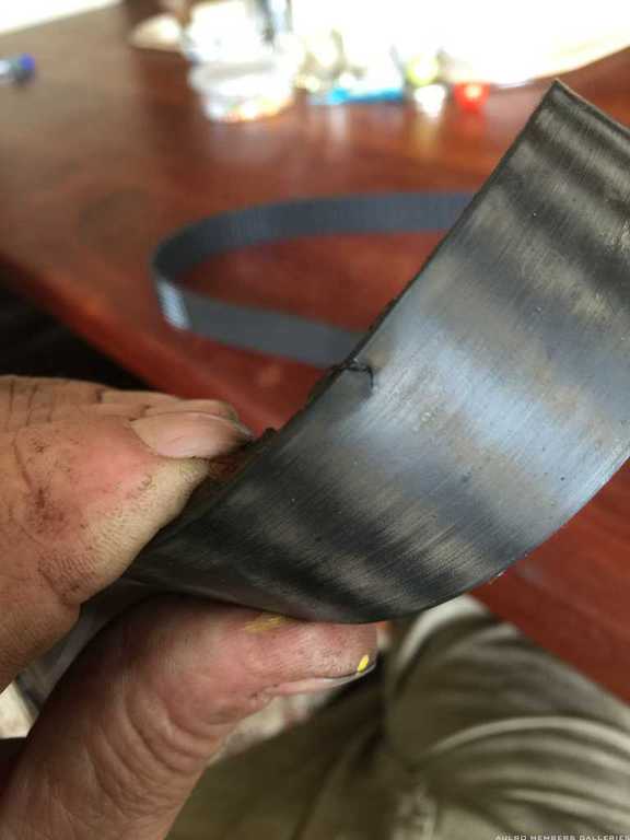 There are a number of tears around the whole belt. They are all on the front, that is the side that faces you as you look at the installed belt.