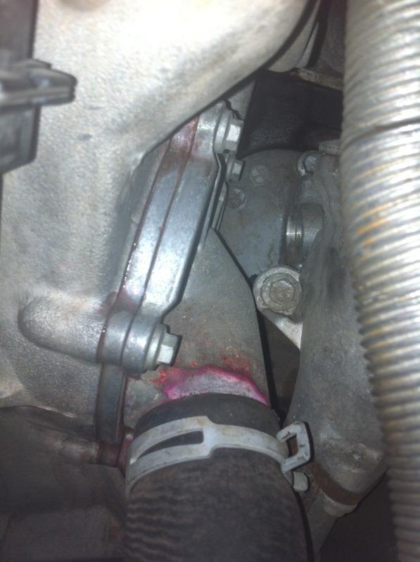 Sorry yet another dumb question. This 'thing' is leaking radiator fluid and needs a new gasket apparently....but don't know what it's called.It's the silver center part with bolts in it...above the pink stain. I hope that makes sense!! Thank you in advance for all your help!!