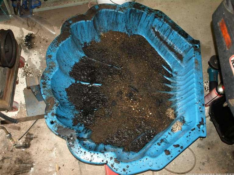 Large enough to extend past both chassis rails, and since it curves in at the bottom you can throw a bit of kitty litter around it to catch anything that does happen to drip over. Once you're done just scoop up the kitty litter and throw it in to soak up the gunge.