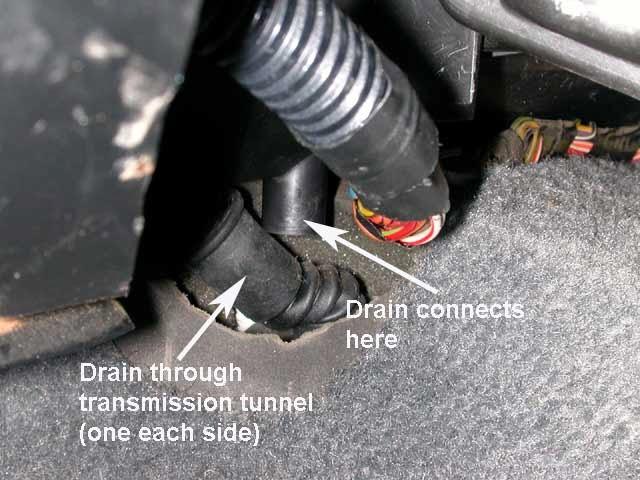 The drains are at the outer edges of the trans tunnel, if you take a torch and look in front of and around the center console you should see them. Not an easy job to push them back on though, ten joints and 6 inch pencil like fingers wil help!