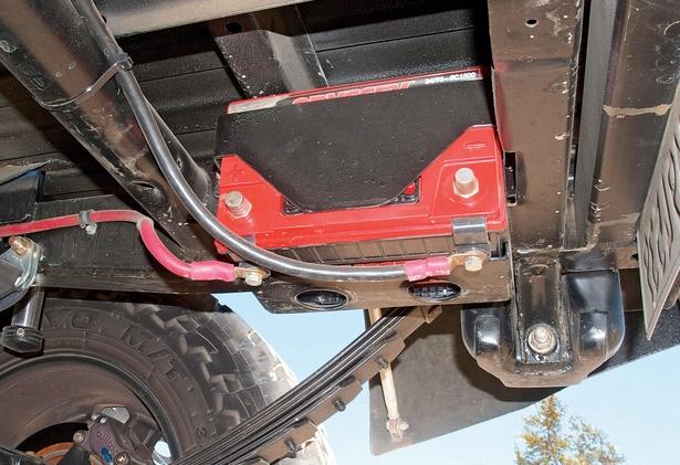 I have mounted one on /in front of the right rear crossmember behind the fuel filler neck and fitted an Al shield--it is just a normal deep cycle battery--may depend on how high your tray is above the crossmember.
