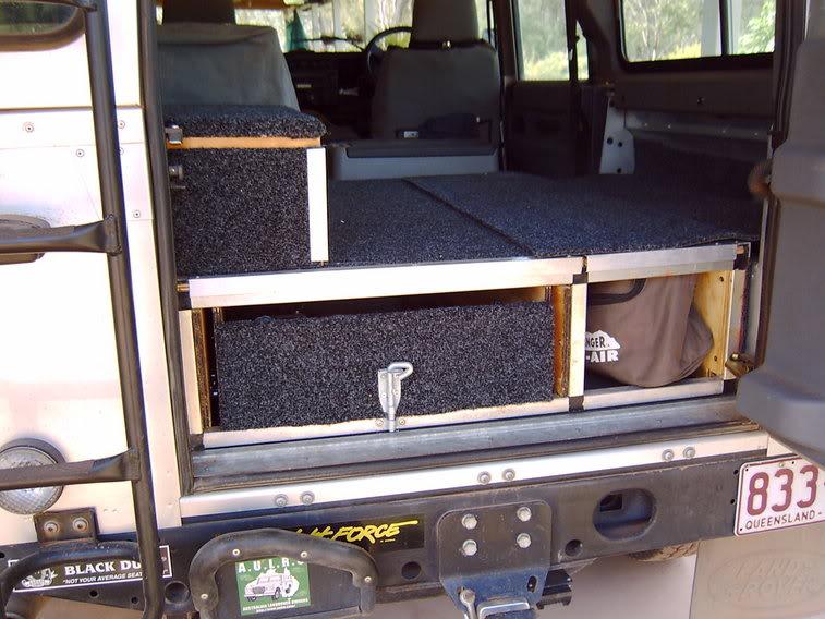 This is my setup. The drawers are all steel - (drawer & frame) cut & folded by a cnc-controlled system. It rides on four roller bearing drawer runners. Sitting in front of the drawer behind the cargo barrier and under the drawer's top deck is an 80-littre stainless water tank designed by a good mate of mine and built by Out of Town 4WD in Newcastle. It's filled through the side window (second photo). The tap is mounted to the rear bumper. On top of the drawers is a steel shelving system which takes plastic boxes on the left (built to accommodate the boxes without bouncing around). In the middle is a fridge slide for the trusty Engel or EvaKool. To the right is an area for larger space cases or jerries. It's all pretty solid.