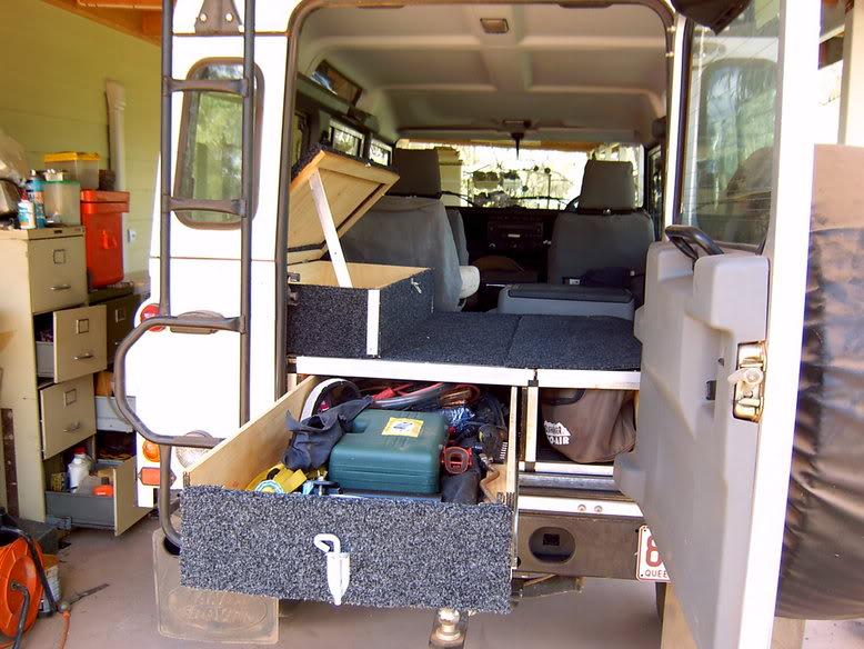 Outback roller drawer, with extra items like lights and umbrellas down the gap on the drivers side.
