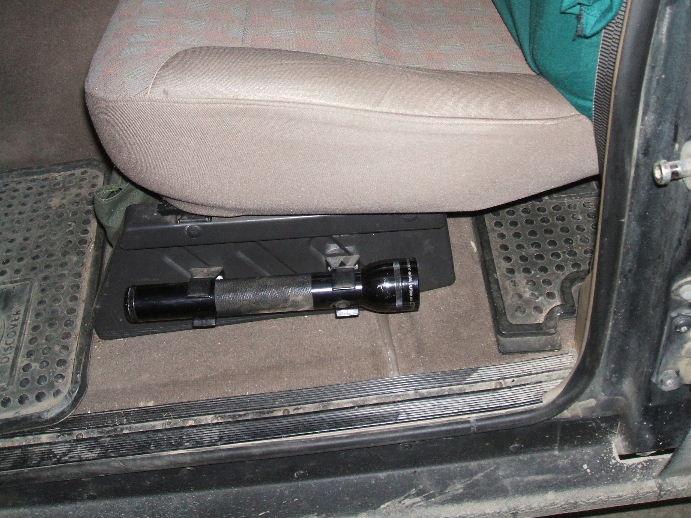 I have a 4D maglight attached horizontally to the front of the drivers seat box up the top behind my knees using a couple of maglight clips.
