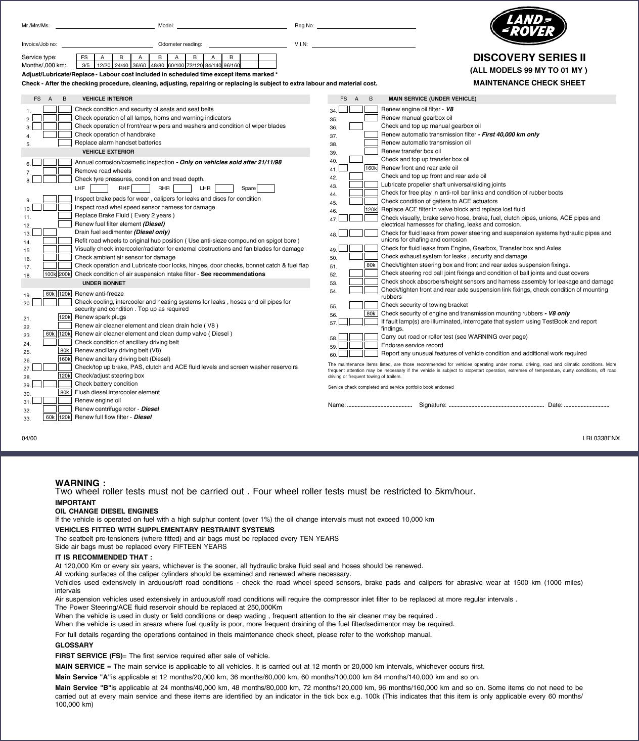 I have the workshop manual for the 2002 td5 II, but I can't seem to find what is required to be checked/replaced for a 100,000k service.