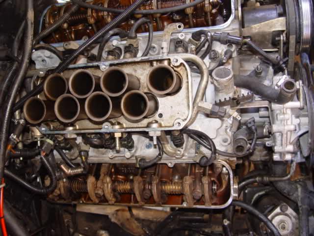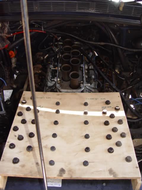 where I'm at right now, all head Bolts have been removed as seen on the board , Fuel Rails is off , Now I'm still stuck with the power steering Pump , the captive nut is off , however the b@#$%^D won't rotate oh and taking out the Plenum housing, It won't come off......
