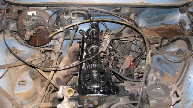 I decided I'd remove the head and check out the condition of the bores and replace the gasket (it was overheated) to get the sheared bolt out, but when I removed the rocker cover I was greeted by an overhead camshaft.