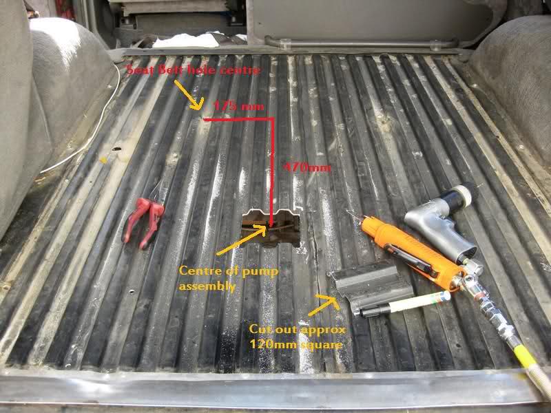 From the centre of the left hand seat belt hole accross 175 mm and down 470 will land you dead centre in the middle of the pump.