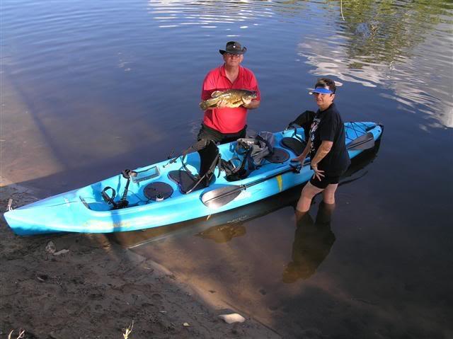 We use a Hobie "Mirage" Tandem and find it ideal for the paddling (Pedalling) we enjoy in creeks, rivers and backwaters. Both hands free for whatever and handy for fishing. The shot was taken at Jingellic on the Murray and the cod went 63cm, near to 5kgs and tasted absolutely fantastic. Not big enough to have much fatty deposits.