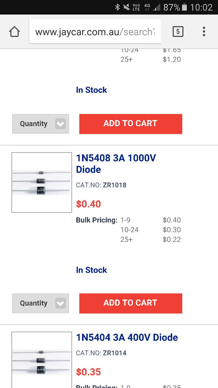 The 3A diodes would be fine for most application (loads up to 36W). I originally installed a 3A diode that was fine with my van (LED lights) but died with my crappy box trailer. When I did the math the box trailer brake light globes were pulling a little over 4A. So I bought some 6A diodes from Jaycar... had to buy 10... have 2 left. If you PM me your address I'm happy to send you one.