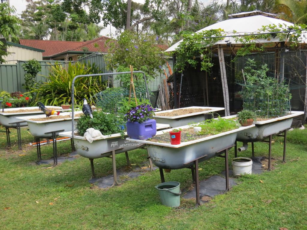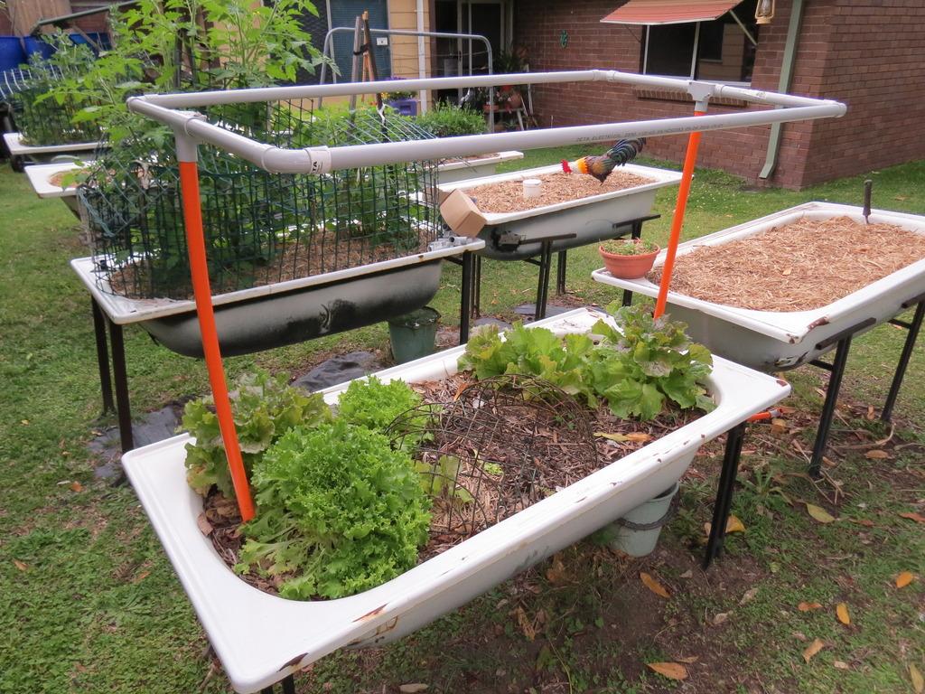 A couple of years ago we had a bit of a drought and as a result of this we found that recycling old bath tubs mounted on old school desk bases was an ideal way to keep the vege patch reasonably weed free and also gave an opportunity to collect and recycle water that was surplus to the plants requirements when watering.