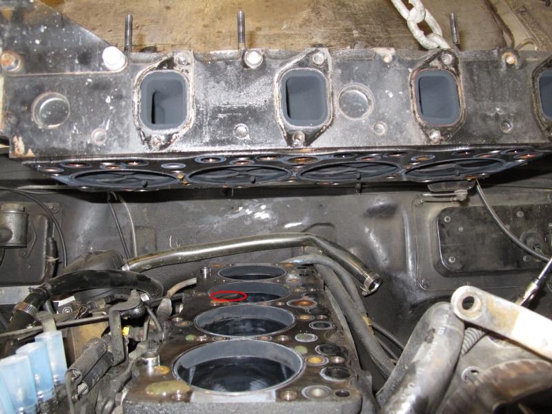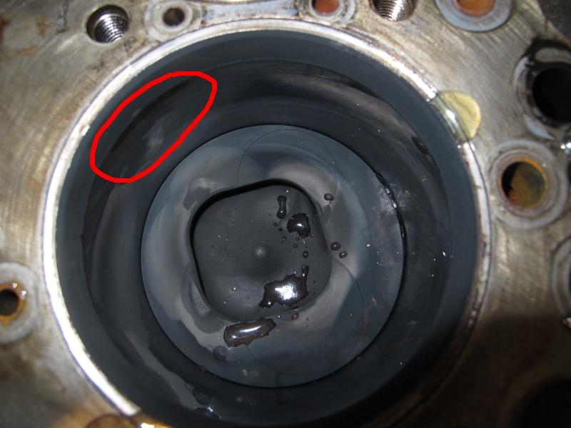 First progress photo. Head is off. The gasket is stuck to the head, the block surface is clean and there's a scary wear mark showing on cylinder #3 (circled in red).