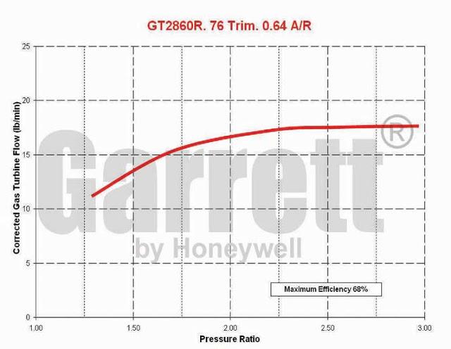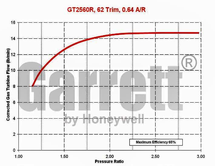 The Borg Warner EFR6258 turbine starts at about the point of a Garrett GT28 turbine with a 0.64 A/R housing on it.