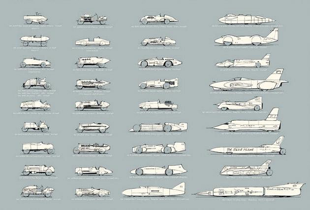As a species, we've been obsessed with pushing ourselves ever faster since we first took to two legs. It should be no surprise, then, that the internal combustion engine and the land-speed record have evolved at roughly the same pace over the last century or so. In order to celebrate the Bloodhound SSC's quest for land speed supremacy, designer Stefan Marjoram took on the ambitious project of creating a massive poster commemorating and comparing history's official land-speed record holders. Even better, if you have the wall space and are so inclined, you can pick up a massive 16.5 x 23.4-inch copy for yourself.