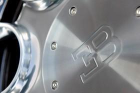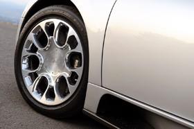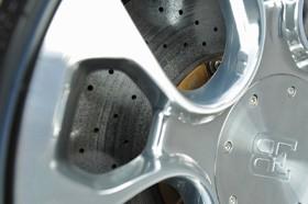 The Bugatti's carbon ceramic brakes are 15.75 inches in front, with eight-piston calipers squeezing four pads apiece. In back, the brakes are 15 inches and wear six-piston calipers with two pads apiece.