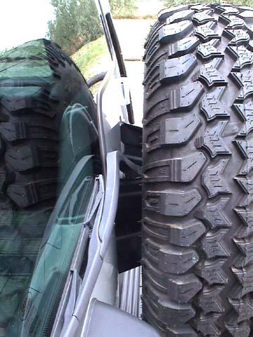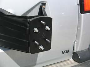 Britsh Parts of Utah offers a brand new product for relocating the spare tyre on the carrier on the rear of the Discovery I and II. The relocator works by slightly shifting the spare wheel up (by about 1 1/2") to clear the rear bumper, enabling the fitment of larger tyres.