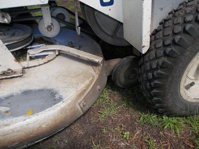 Aluminium deck but a piece had been torn out of the back taking an anti-scalp wheel mounting with it. Someone made a steel 'patch' with a bracket for the wheel. Different sized wheel to the other side !