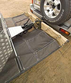 I have an Adventure Camper Trailer and the stone guard supplied is similar except that it connects to a cross bar attached to the tow coupling. This means that there is no gap even when cornering and that the guard must have elastic connections.