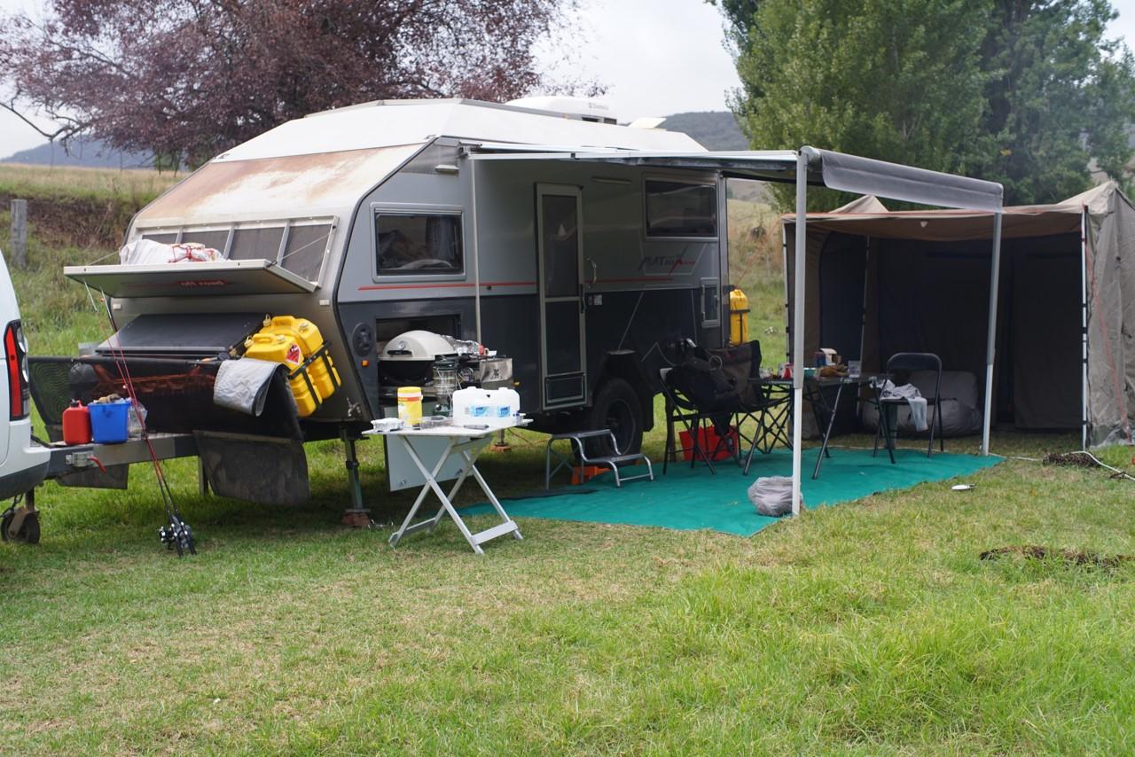 Glamping I guess but it goes most places (aided by its 1950mm width) and doesn't leak dust at all. Tough suspension and tows great. Has I think all mod cons but for grey water. At the rear is what we had before - an Oztent. My son and his girlfriend joined us with that attached. The van includes a Webber, which is a great addition for any kit I reckon.
