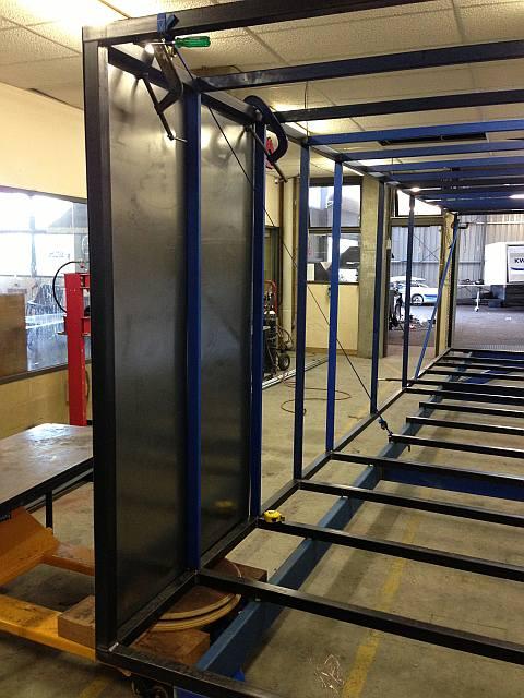 if you put your verticals in at the ends of where your planning on running the tubs (so the joint of the first complete joust either end of the suspension) and joined them with 3 Xs (one on either side and one bowed up in the middle to give the roof a little rise to aid run off and to prevent roof sag) put all your verticles on, weld diagonals at the 4 corners that run back to the top of the box over the axles, support the chassis on the 4 corners add about 1/3 of the predicted payload to the center then weld the diagonals onto the top corner of the box you'd very neatly stiffen it up ready to have the axles and wheels bolted under.
