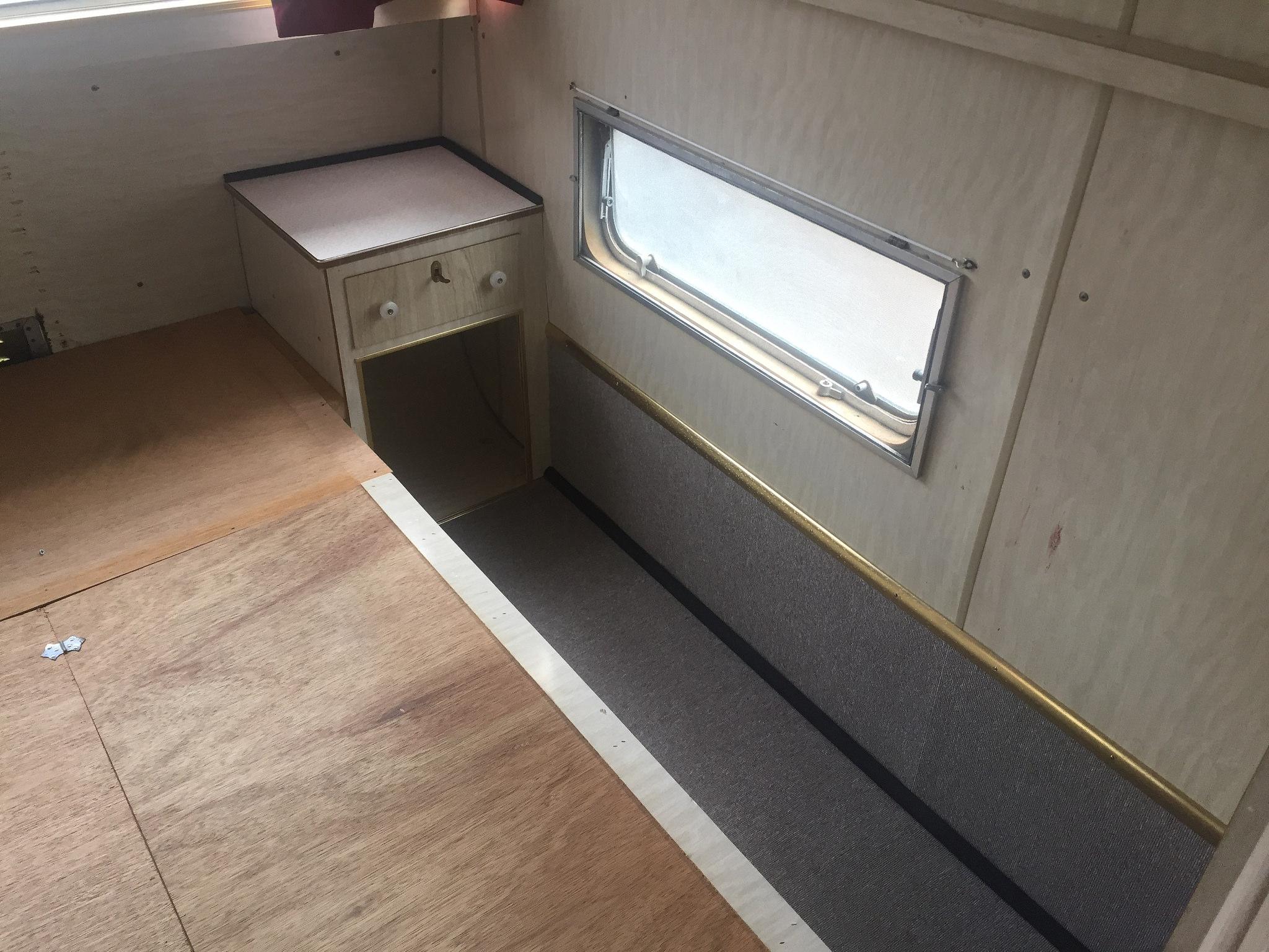 Ok, finished one side of the bed off. Not 100% happy but it's ok. The carpet I'm happy with - it's almost an exact match for the original - same style but just a shade or two lighter, so all good there, I think it looks fine. The gold trim I used at the top edge on the wall is a bit thick for my liking but beggars can't be choosers - I needed 3 decent lengths so had to go with what's available these days - looks ok. The bottom cupboard bit will get a curtain hung in it as well I think which will help break up the beigeness (is that a word? 😁 ) of the area.